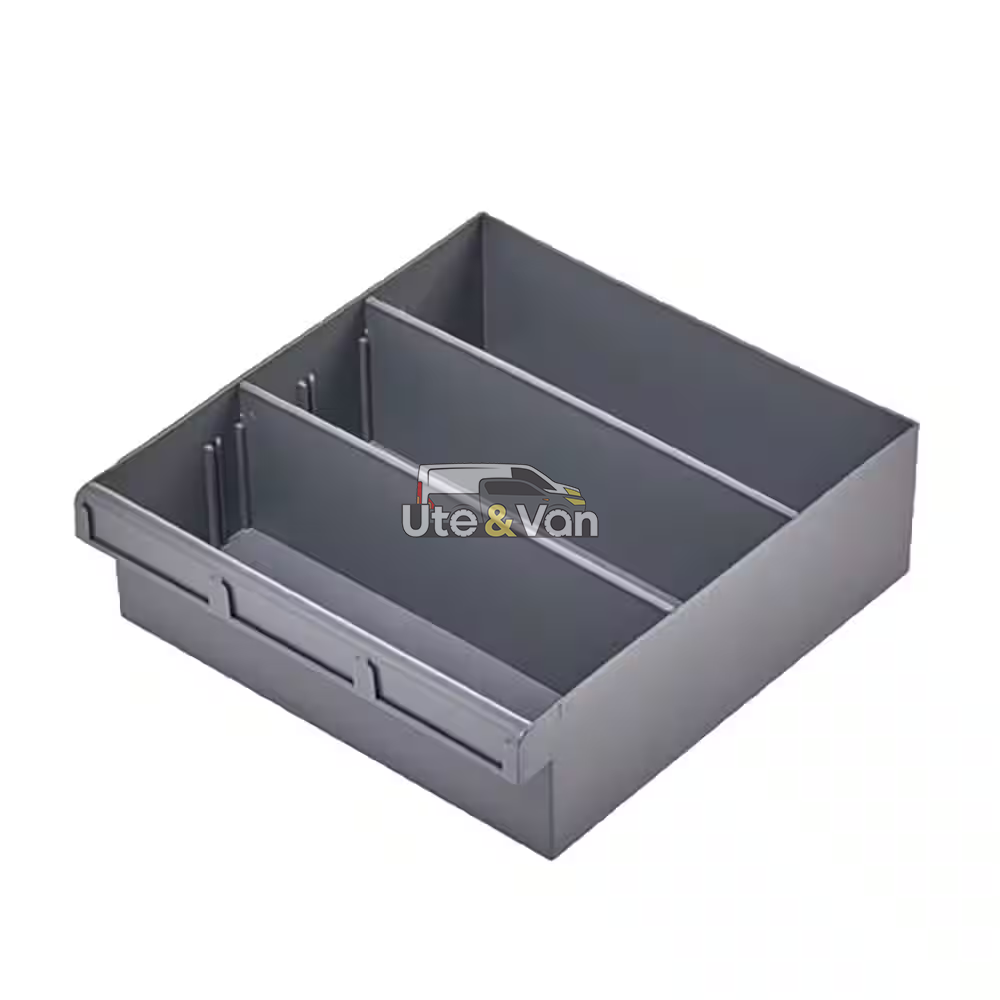 Grey Plastic Tray Storage Tub Tech Bin (300 L x 300 W x 100 H) with Dividers - suits 300mm Shelf